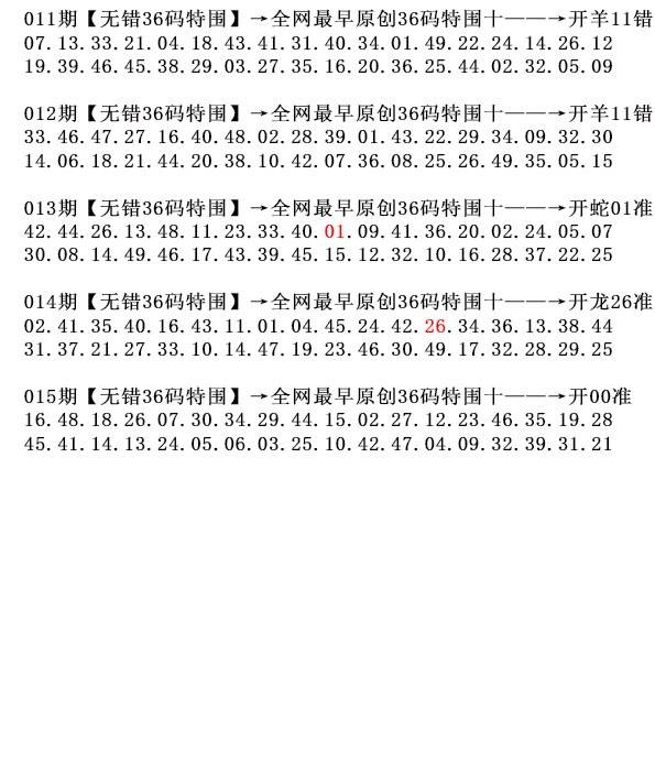 015期 精选五不中 〖02-07-18-21-26〗 015期 开: 00-00-00-00-00-00 T00 准 |